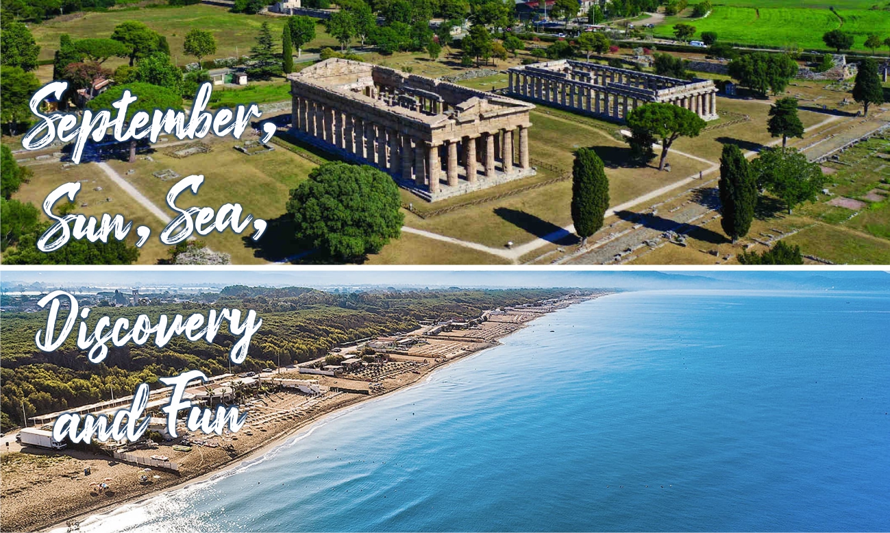 Paestum shines blue in September, the sun illuminates long days with a summery feel.