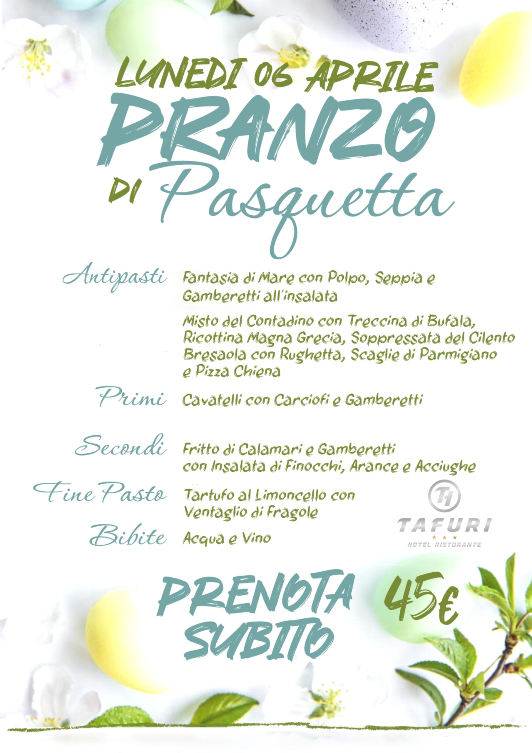 Un caldo sole estivo, la brezza marina, la storia, il mito e la bellezza unica del paesaggio: la cornice adatta per una Pasquetta indimenticabile. Il Tafuri Hotel, situato a pochi passi dal tratto di spiaggia più bello della città, sarà la location ideale per trascorrere il pranzo di Pasquetta in un ambiente elegante ed accogliente, gustando i sapori della nostra cucina tipica e trascorrendo una piacevole giornata all’insegna dell’allegria e del divertimento.